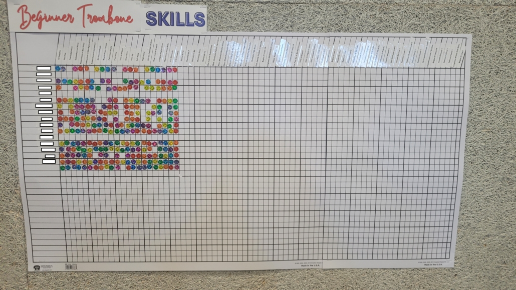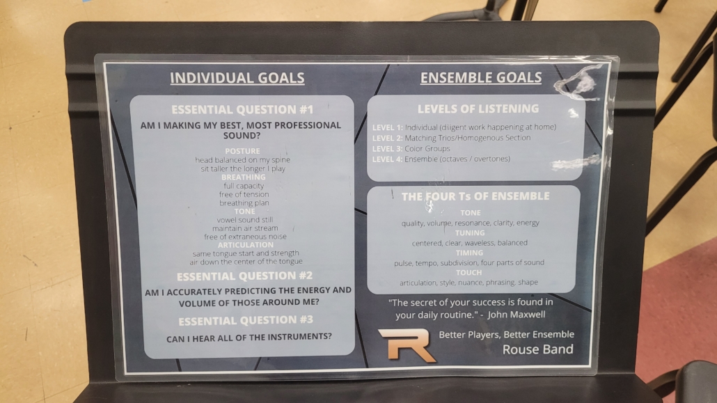 The next morning was spent at Wiley Knox Middle School where their band program includes over 375 students of the 780 cohort. The main rehearsal space was set permanently for a 65 piece wind ensemble and I was impressed with the trumpet sectional coming in 15 minutes early for class and independently setting up quietly with their instrument, music folder and tuner on the stand. The structure of the classes was similar across the instruments, beginning with writing down the weekly assignment, morning notices, fundamentals and repertoire. There was a large sticker chart for each instrument family covering fundamental competencies to be passed. Similar to Lewisville, there was a big focus on tone production through effective air support including using a thickshake straw with the trumpet mouthpiece for buzzing and pitching with the beginners and air breathers for use in the older bands.